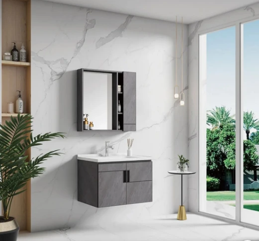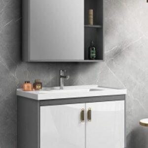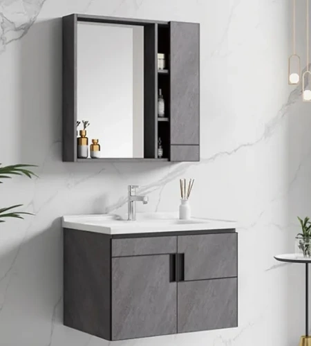 Vanity Cabinet with White Basin and Grey Mirror Cabinet.
